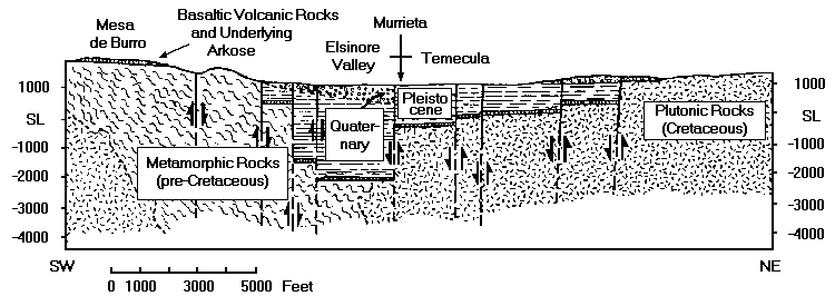The well-known Elsinore Fault forms the basin margin on the southwest and the steep fault scarp of the Santa Ana Mountains. Two miles southwest of Murrieta, and capping Burro Mesa at an elevation of 1700 feet, are the Santa Rosa Olivine Basalt flows (10-100 feet thick). These same lava flows also cap the Hogback at a similar elevation three miles northeast of Murrieta. This basalt flow has been dated as Late Pliocene-Early Pleistocene -- roughly two million years old.